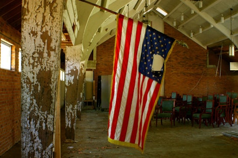 ![]() A Church of KatrinaGulfport, MississippiThis flag remains in the empty destroyed church of Mississippi City United Methodist Church in Gulfport. The church is just two blocks from the Gulf Coast and was destroyed by Katrina. I was touched to see the original flag stil lin the building. There are water stains throughout the flag and the one large hole, other than that it’s in relatively great condition. To put it simply, the flag will mean a lot more than ever after this 50 state tour. | ||